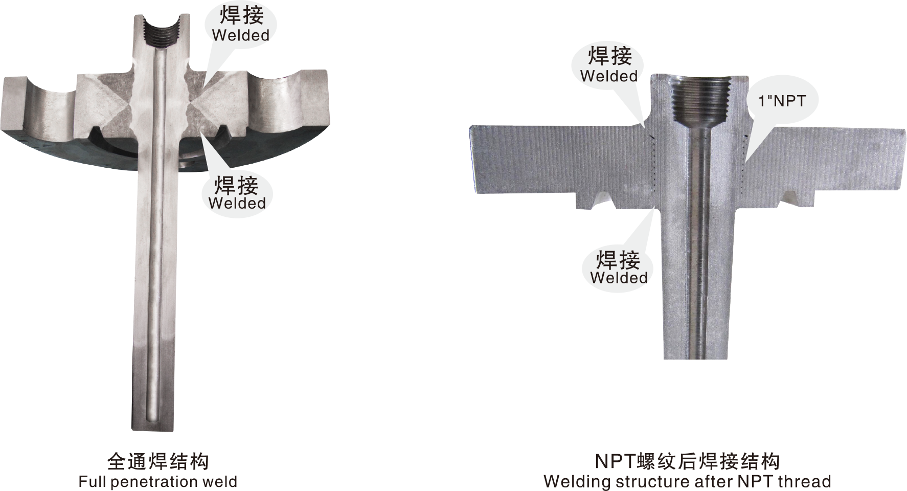 可選用NPT螺紋擰緊后焊接,全通焊或法蘭保護管—體式鍛造結構。