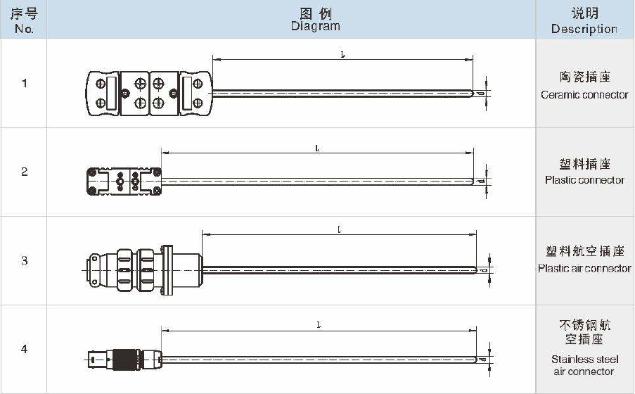 插座式熱電偶(阻)接線采取插拔式結構,具有安裝方便、重量輕的優(yōu)點,我公司配有各種形式的陶瓷、塑料及不銹鋼材質的插座。